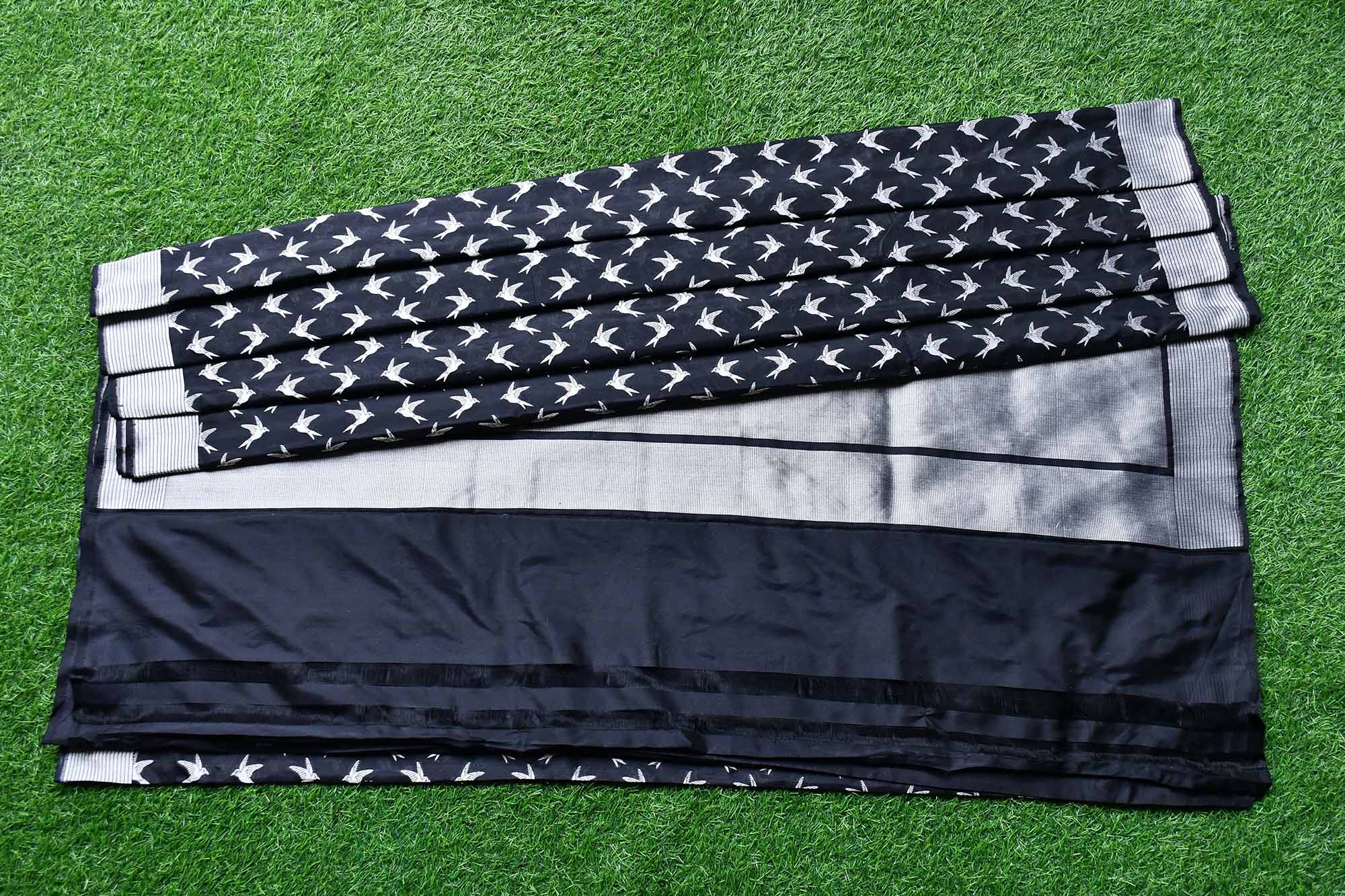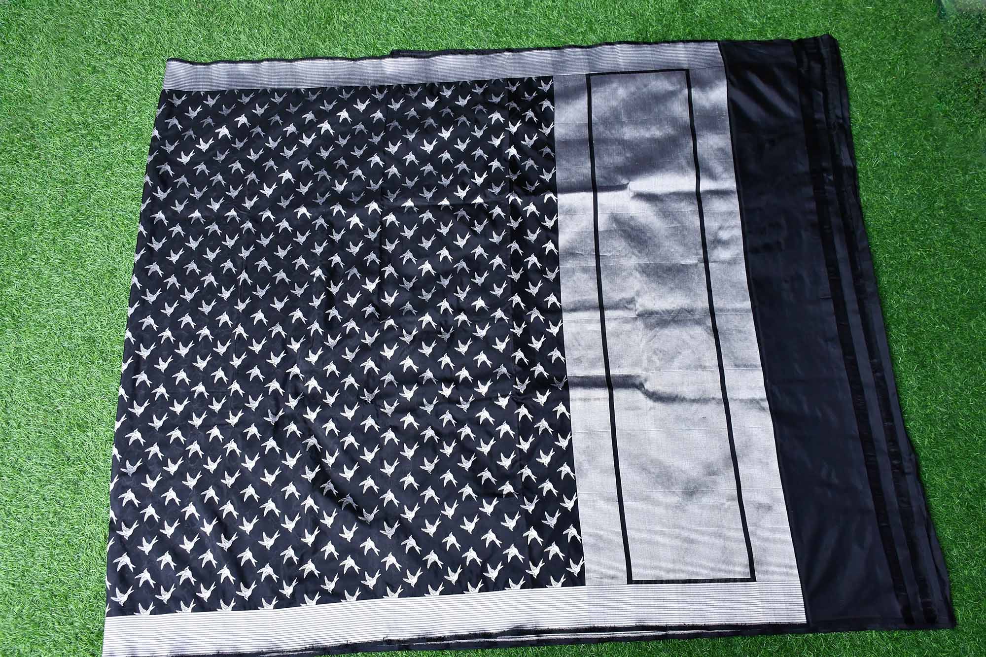 Banarasi handloom black Katan silk saree featuring exquisite bird motif weaving. Handcrafted by skilled Banarasi artisans, this pure silk saree offers a rich texture, elegant drape, and timeless craftsmanship perfect for weddings, festive occasions, and traditional celebrations.