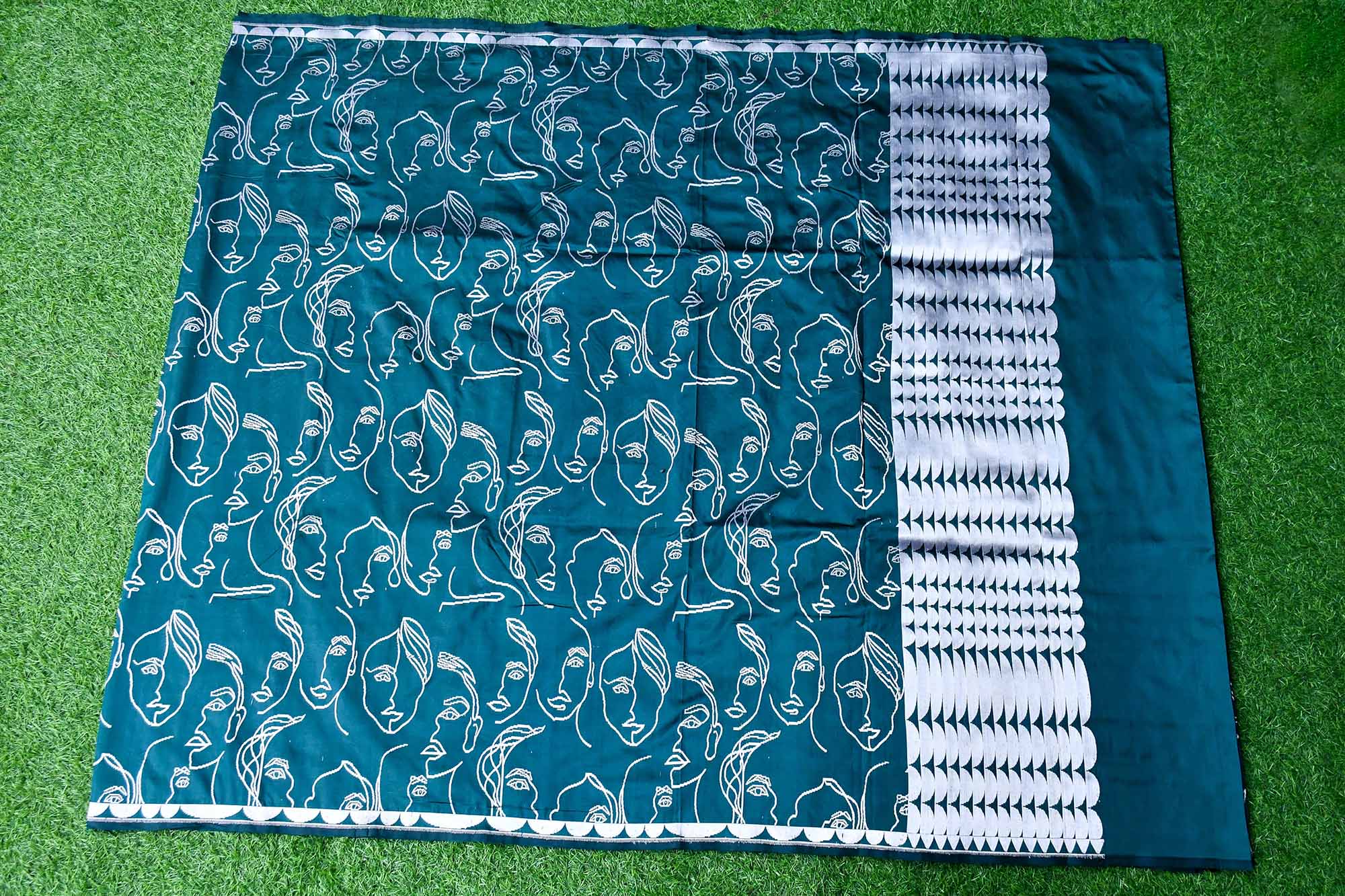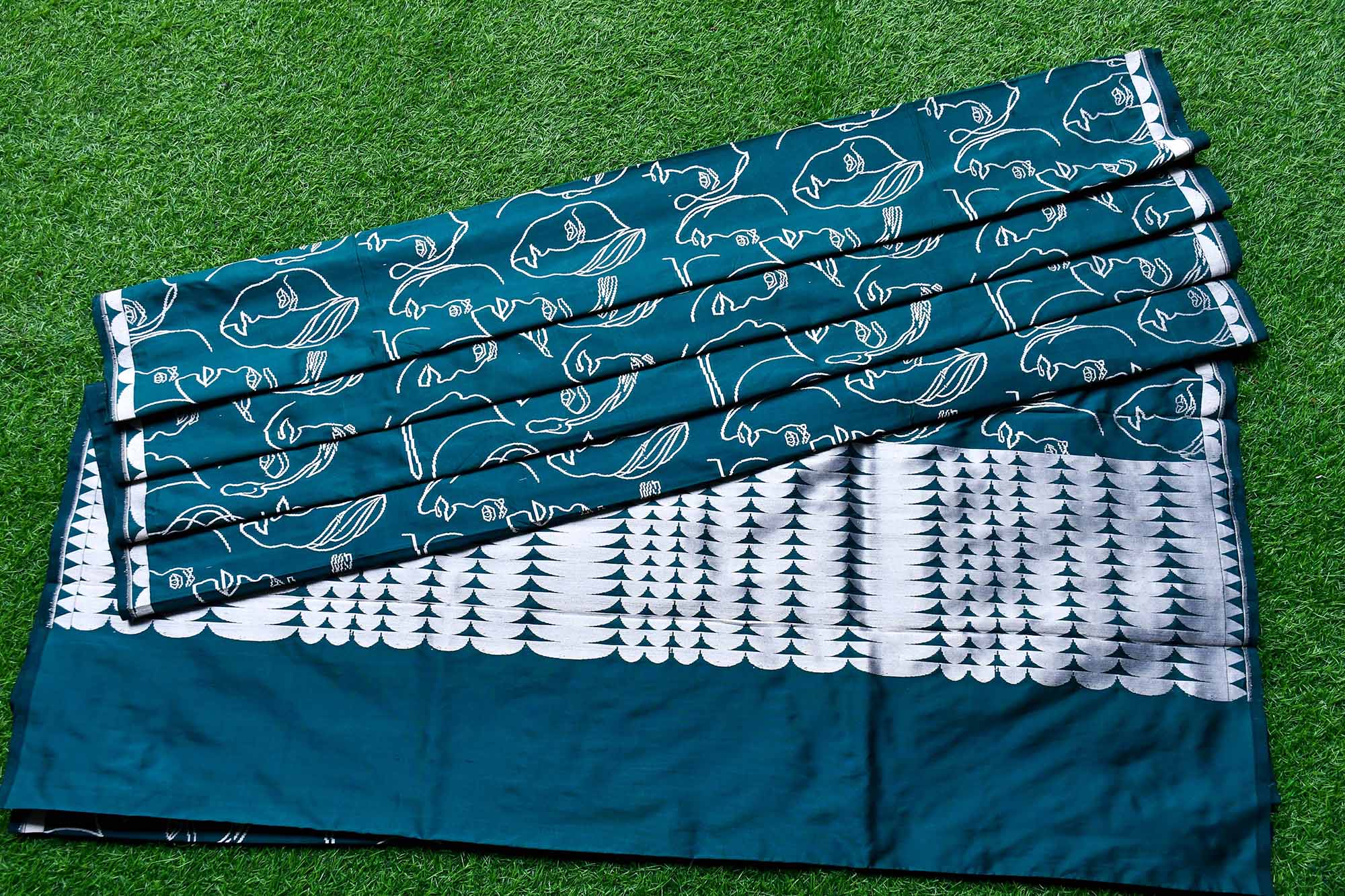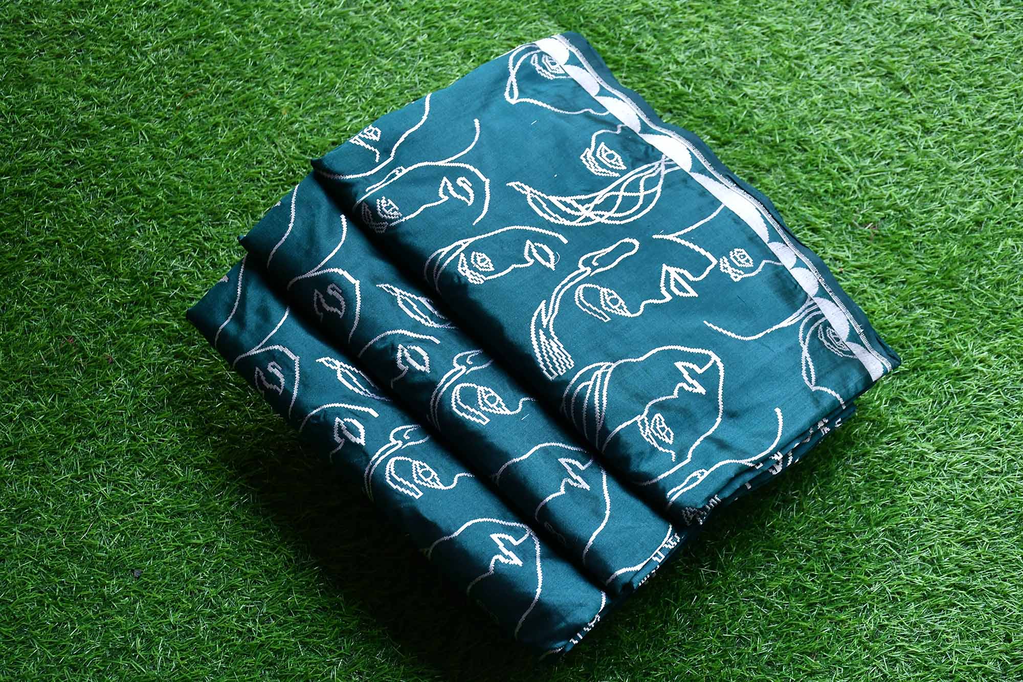 Banarasi handloom bottle green Katan silk saree featuring intricate face motif weaving. Handwoven by skilled Banarasi artisans, this pure silk saree offers a rich texture, elegant drape, and timeless craftsmanship perfect for weddings, festive occasions, and traditional celebrations.