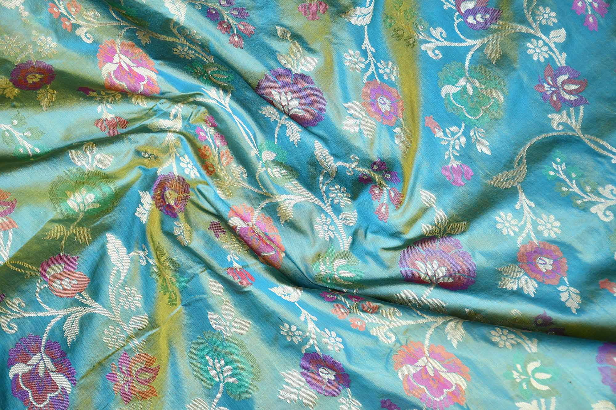 Banarasi handloom sea green Katan silk saree featuring exquisite multi-meena jaal weaving. Crafted by skilled artisans, this luxurious silk saree offers rich texture, elegant sheen, and timeless appeal ideal for weddings, festive celebrations, and traditional occasions.