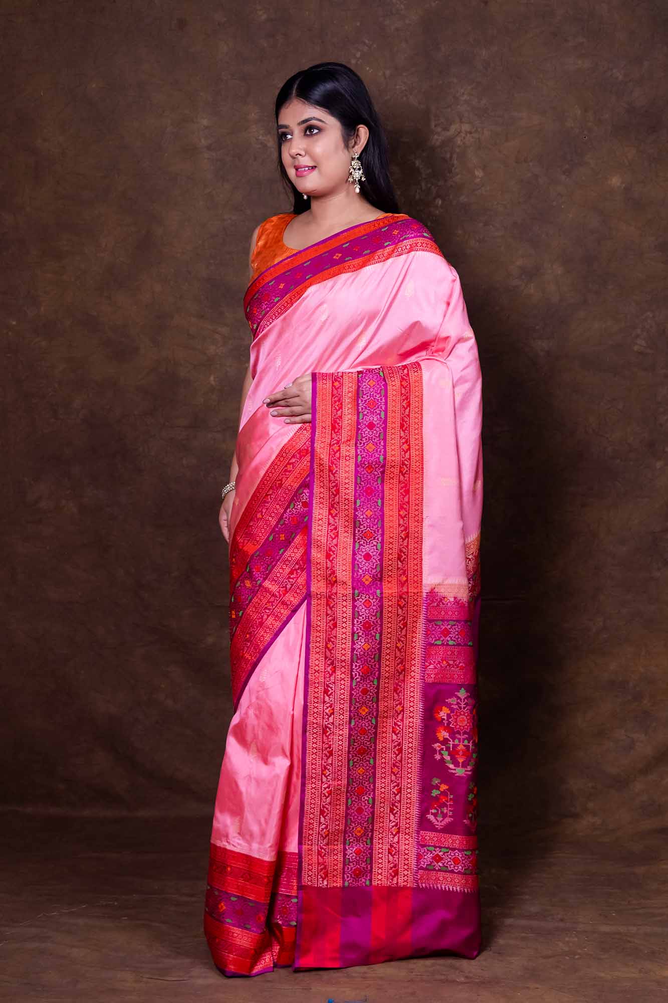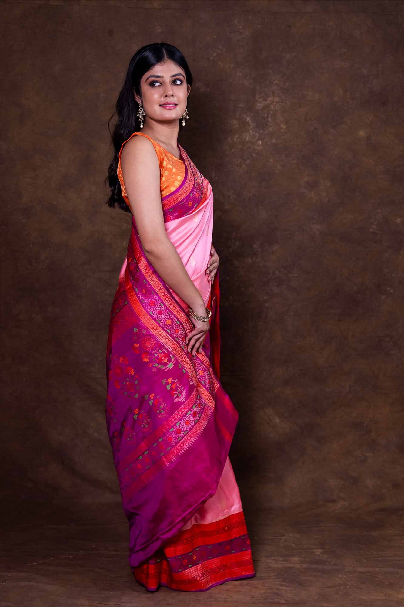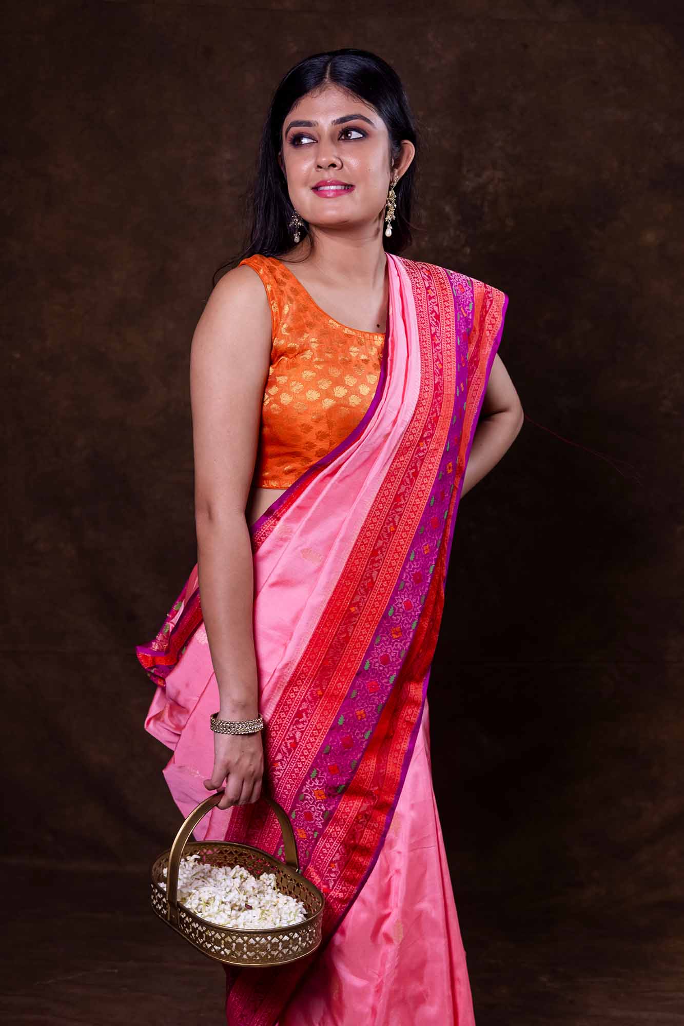 Handloom Banarasi pure Katan silk border saree crafted with intricate detailing using traditional weaving techniques. Meticulously handwoven by master weavers, this Banarasi saree showcases refined craftsmanship, a lustrous finish, and enduring charm ideal for bridal and festive wear.