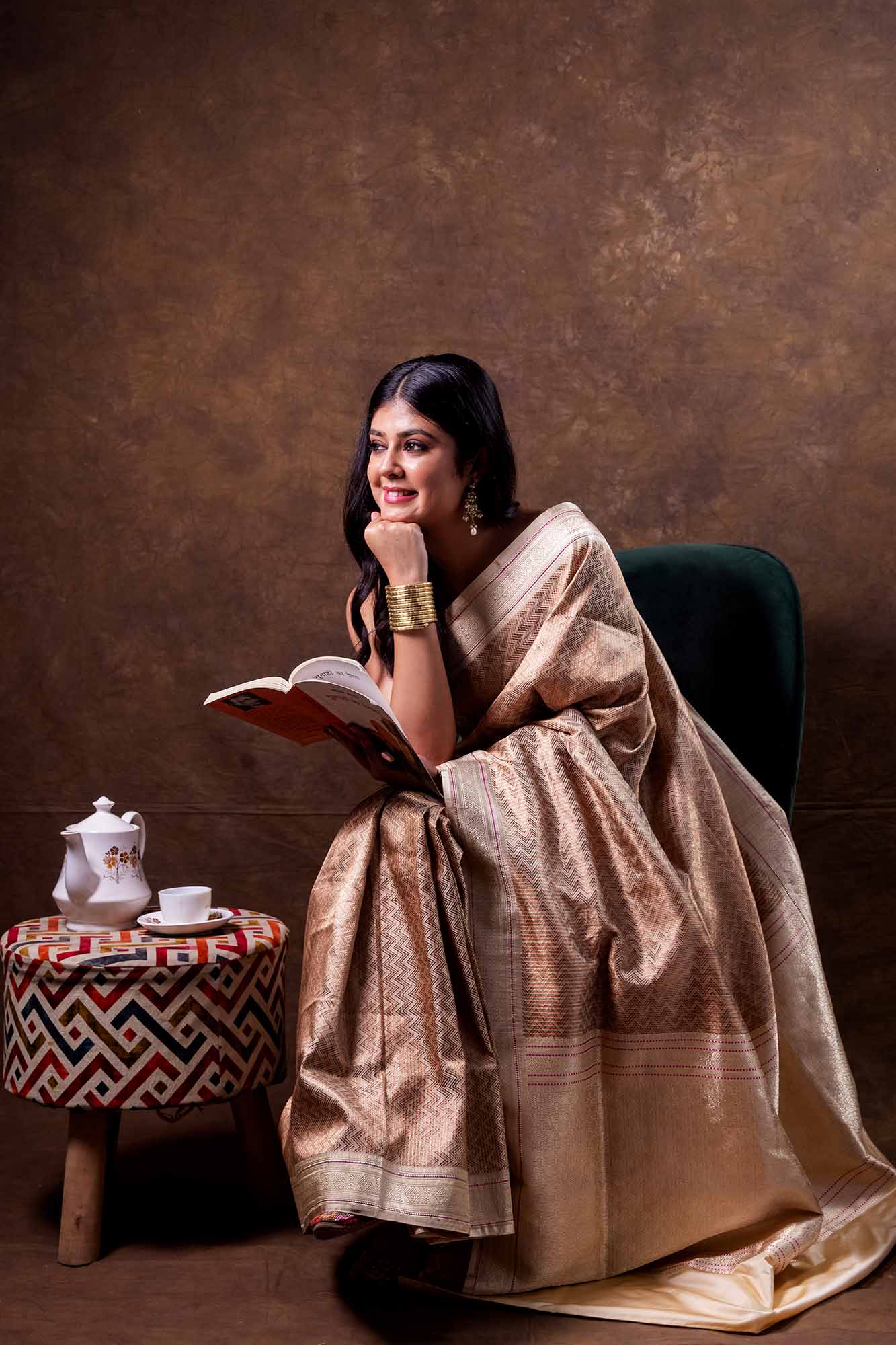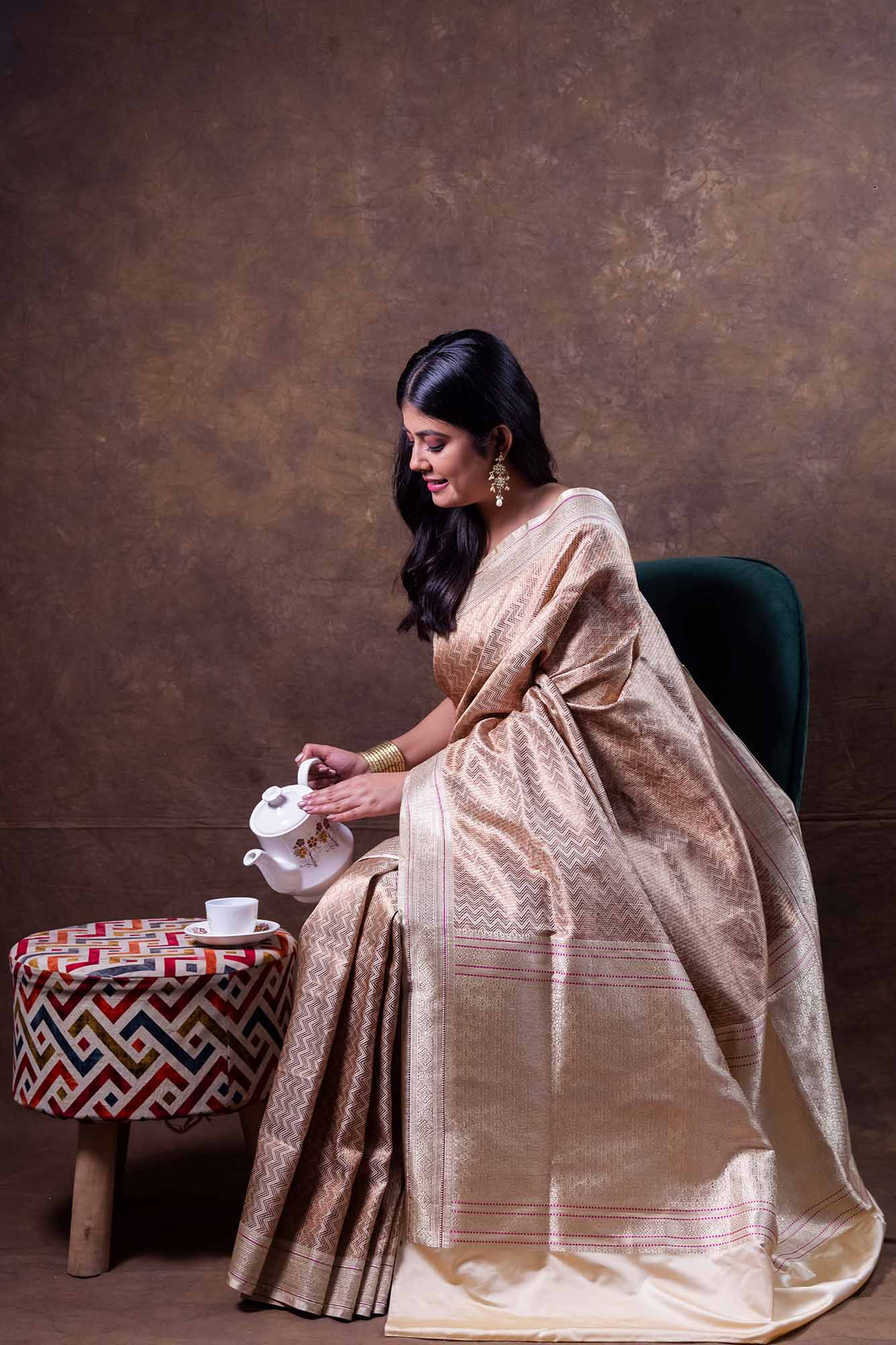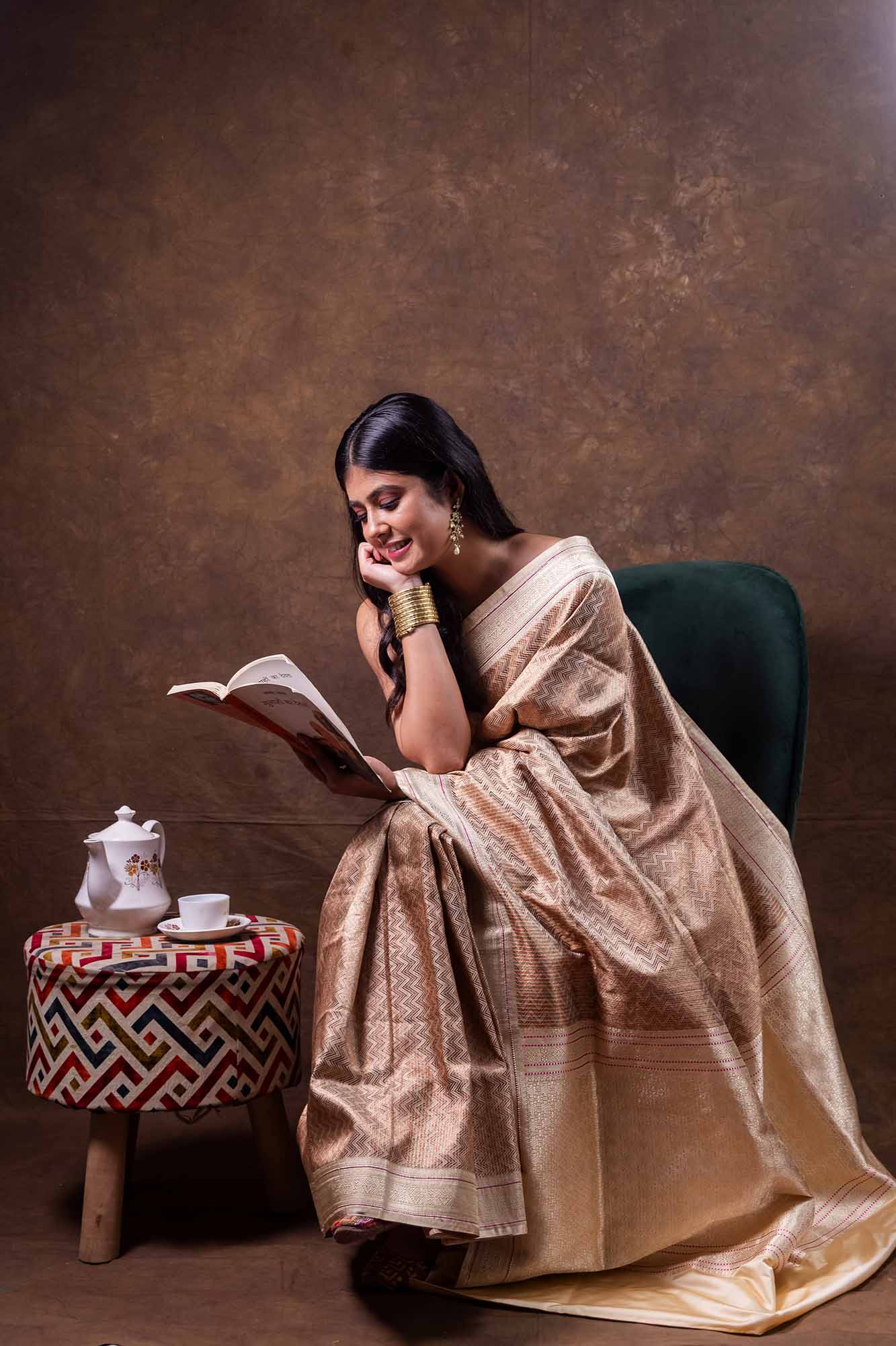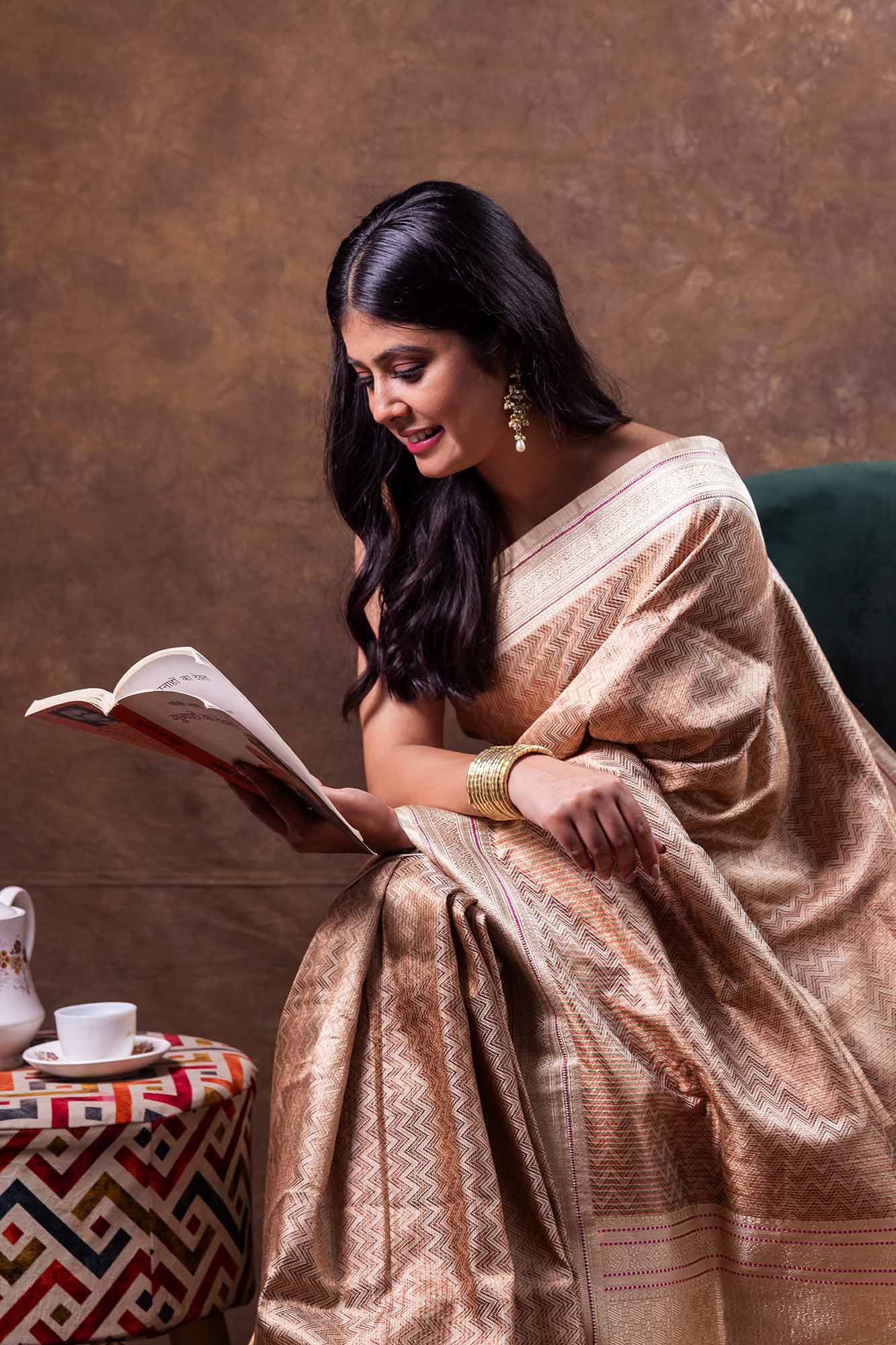 Handloom Banarasi pure Katan silk geometric weaved saree crafted with precise patterns using traditional handloom techniques. Meticulously handwoven by master weavers, this Banarasi saree showcases a lustrous finish, elegant fall, and enduring charm ideal for bridal and festive wear.