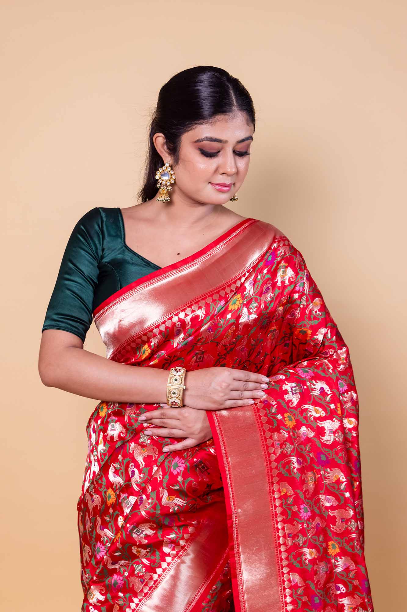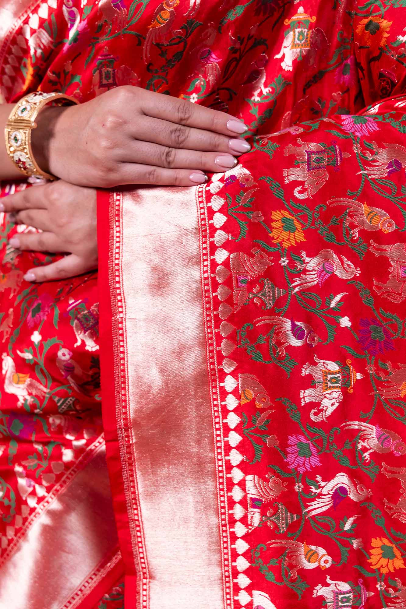 Handloom Banarasi pure Katan silk saree featuring intricate multi-meena Shikargah motifs inspired by royal hunting scenes. Expertly handcrafted by skilled artisans, this luxurious Banarasi silk saree offers a rich texture, graceful drape, and timeless elegance perfect for weddings, festive occasions, and heritage collections.