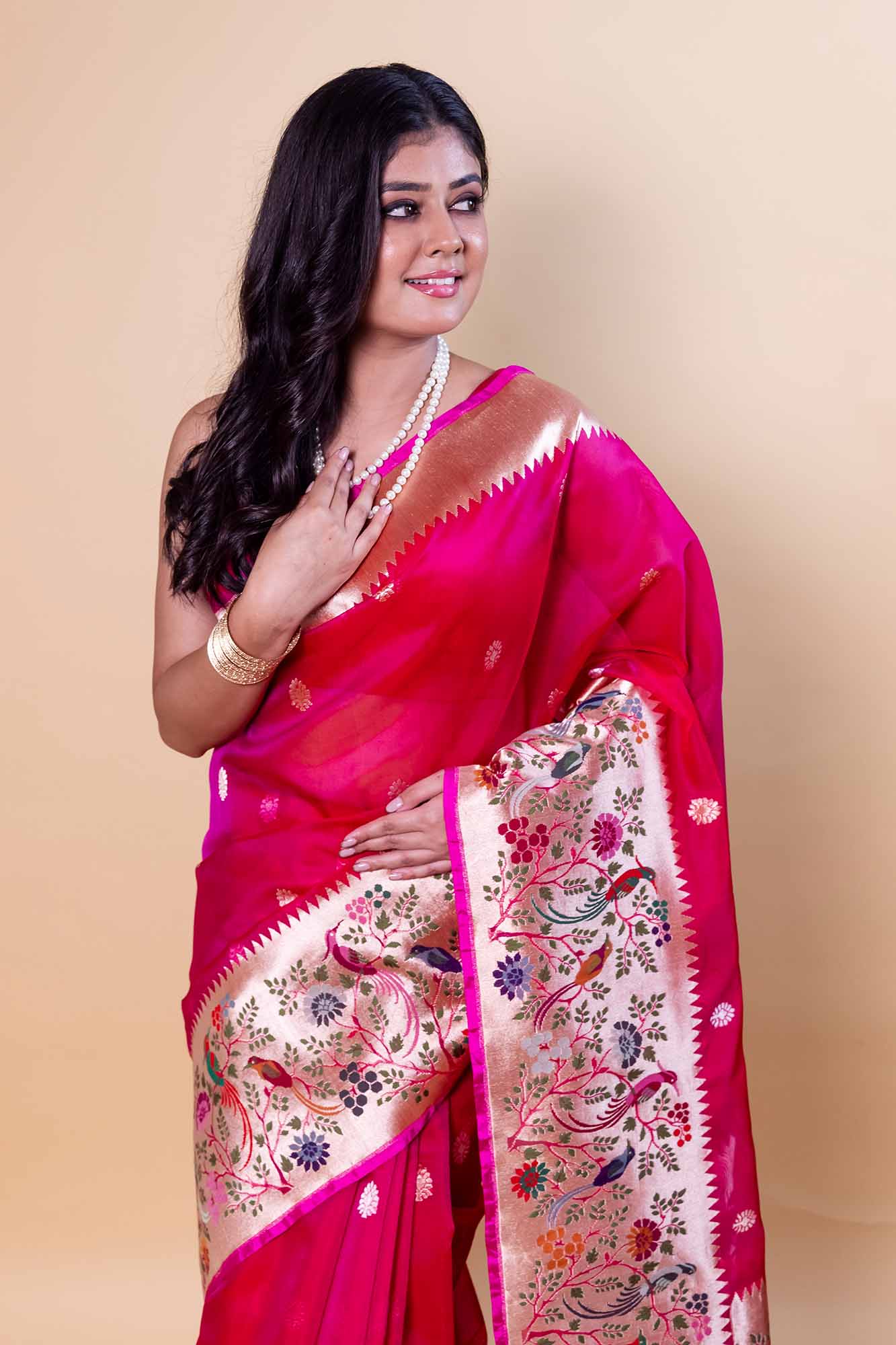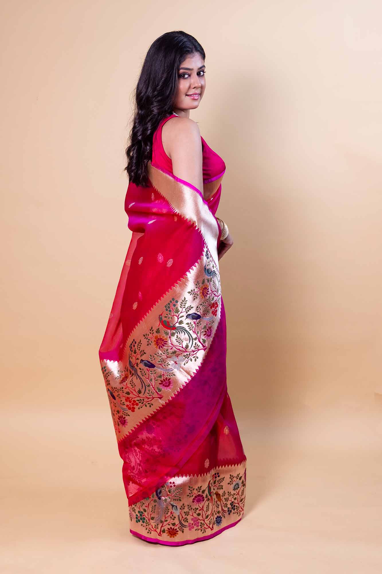 Handloom Banarasi pure Katan silk saree with an exquisite Paithani border. Woven by skilled artisans, this luxurious Banarasi silk saree features rich texture, elegant drape, and timeless craftsmanship perfect for weddings, festive occasions, and traditional celebrations.